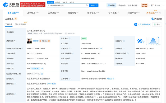 每经AI快讯,天眼查App败露,近日,三一重工(600031)发生工商变更,注册成本由约84.74亿东谈主民币增至约91.95亿元东谈主民币,增幅约8.5%。三一重工股份有限公司竖立于1994年11月,幸运彩法定代表东谈主为向文波,蓄意规模含分娩建筑工程机械、起重机械、泊车库、通用斥地及机电斥地等的销售与维修,提供建筑工程机械租借工作,米兰蓄意商品和技能的相差口业务等。鼓动信息败露,该公司由三一集团有限公司、香港中央结算有限公司、梁稳根等共同握股。