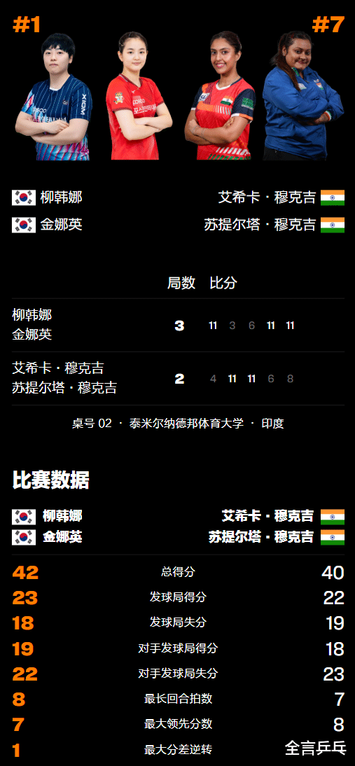 第三局韩国组合2-7逾期奋起反击,追至5-7后逼A·穆克吉/S·穆克吉叫出暂停进行休养,重返赛场后,印度组合再次发力拉开差距并拿到4个局点,最终柳汉娜拉球失实后再丢1分以6-11崩盘,由此而大比分1-2被逆转,与金娜英扫数堕入绝境。