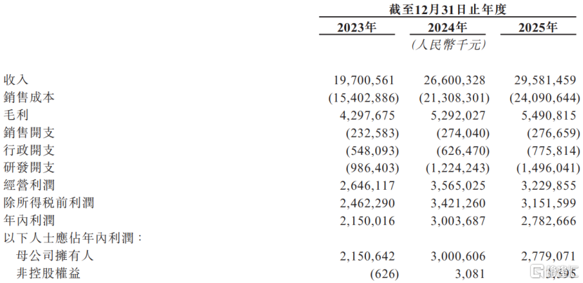 2023年、2024年、2025年,米兰体育官网公司的收入分别约197.01亿元、266亿元、295.81亿元,毛利率分别为21.8%、19.9%、18.6%,对应的净利润分别约21.5亿元、30.04亿元、27.83亿元。