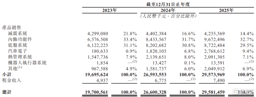 具体来看,2023年至2025年(简称“讲述期”),公司内饰功能件、底盘系统居品销售的收入占比均在30%傍边,减震系统居品销售收入占比从21.8%降至14.4%,汽车电子、热管制系统的收入占比在10%以内。