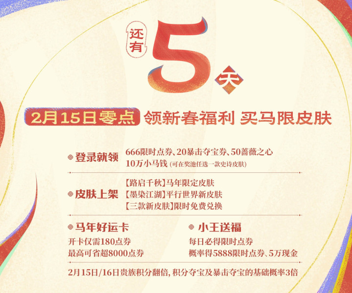 2月15号零点,春节的统统活动就会全面开启了玩家这天唯有登陆游戏,就不错领取大量的奖励。