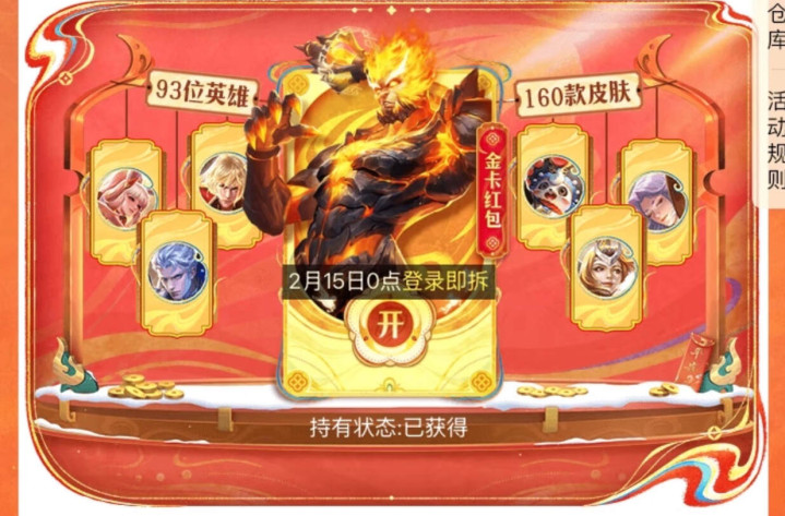 如下图所示,这是qq区的集卡活动,玩家集卡完成不错在春节时候开红包,红包中最高不错拿到听说皮肤,比如梦奇的胖达荣荣、张良的黄金白羊座等等,最低则是一个永恒豪杰。