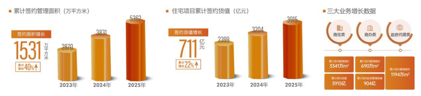 2025年,在阛阓承压下,金地处罚坚捏有质料的增长,中枢事迹见识再创新高,业务结构更趋优化。截止2025年末,金地代建业求实现累计签约处罚面积跨越5362万平日米,同比增长40%;住宅名目累计签约货值超3915亿元,同比增长22%;商办名目累计签约处罚投资限制达904亿元,政府代建限制超1194万平日米。