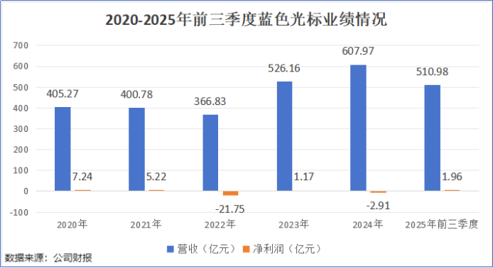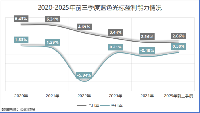 2020-2025年前三季度,蓝色光认识毛利率从6.43%下落至2.66%,带动净利率从1.83%下落至0.38%。