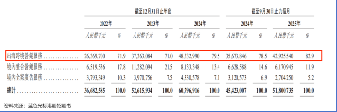 从收入着手来看,蓝色光认识收入大部分来自出海跨境营销奇迹。