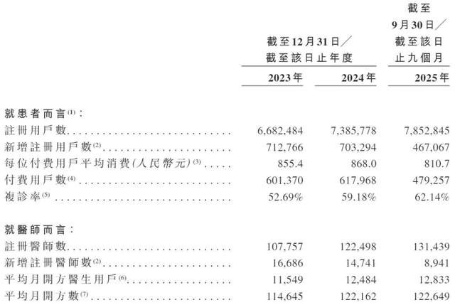 松手2025年9月末,“甘草大夫”平台已连接中国13.14万名医师,月均开方大夫为1.28万名,月均开方12.26万方;平台有785.28万名注册患者,其中付用度户47.93万名,平均耗尽810.7元,复诊率达62.14%。