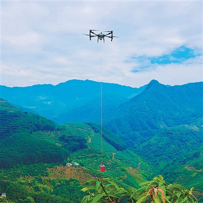 云南红河哈尼族彝族自治州河口瑶族自治县老范寨乡无东谈主机正在运输芒果。