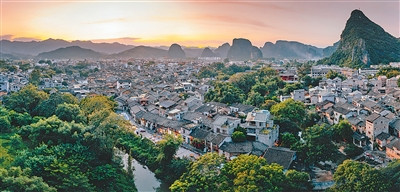 千里浸在暮色里的广西贺州市黄姚古镇景区。