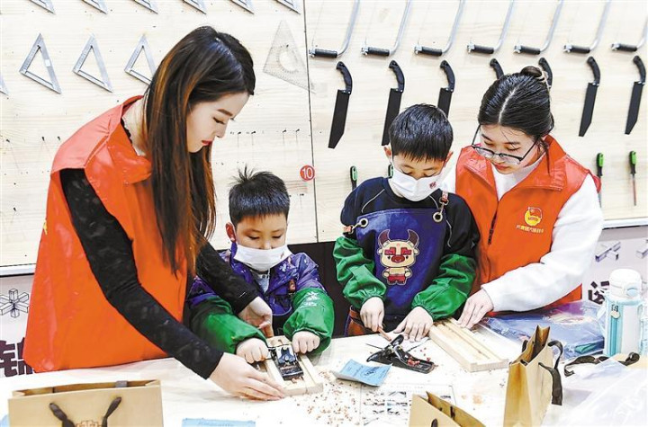 图为返乡大学生志愿者在教小一又友制作红木筷子。本报记者杨雅淇本报通信员刘亮摄