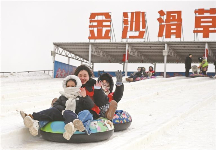 志愿者与孩子们玩冰乐雪。