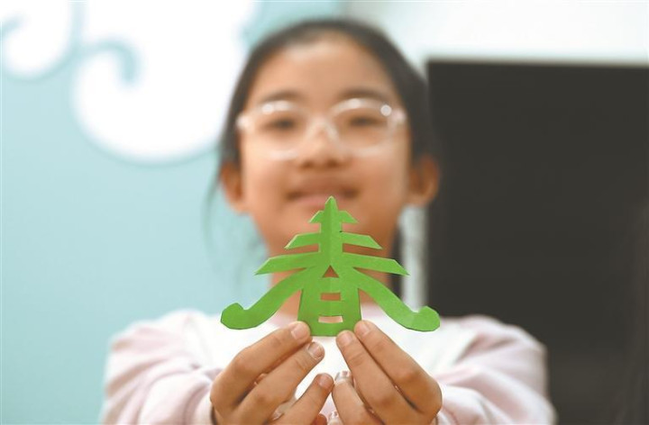 孩子欢叫地展示我方的剪纸作品。