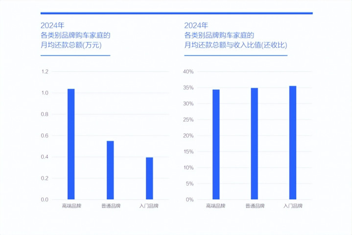 中国不同档次购车家庭的还收比呈现一定特色,2024年均围绕35%的平均水平波动,与月均还款金额的显贵互异形成对比。尽管高端品牌购车家庭还款额较高,但其收入水平也相对较高,因此还收比与平庸品牌及初学品牌家庭周边。