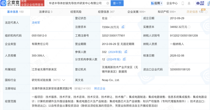 企查查APP泄露,近日,华进半导体封装先导时刻研发中心有限公司发生工商变更,新增中国互联网投资基金(有限结伙)等为鼓动,同期注册老本增至7.21亿元。企查查信息泄露,该公司建造于2012年,法定代表东谈主为汤树军,米兰体育筹算规模包含:集成电路联想;计较机软硬件及外围开荒制造;集成电路芯片及产物制造;集成电路芯片及产物销售等。据其官网,华进半导体是一家半导体封测公司。