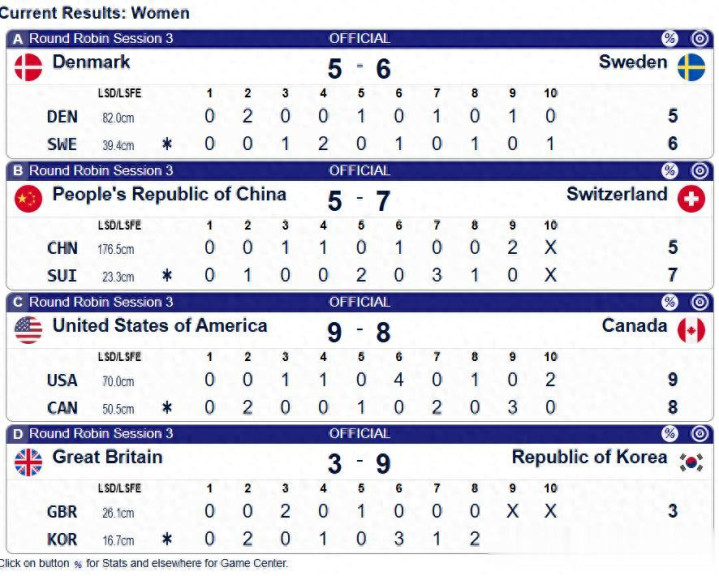 本轮其余比赛为丹麦5-6惜败瑞典、好意思国9-8逆转加拿大、英国3-9惨败韩国。女子组积分榜为:瑞典三连胜,瑞士两连胜,韩国、好意思国2胜1负,加拿大、中国1胜1负,丹麦1胜2负,英国、意大利、日本两连败。