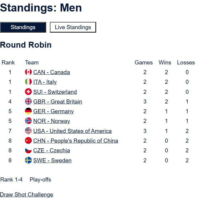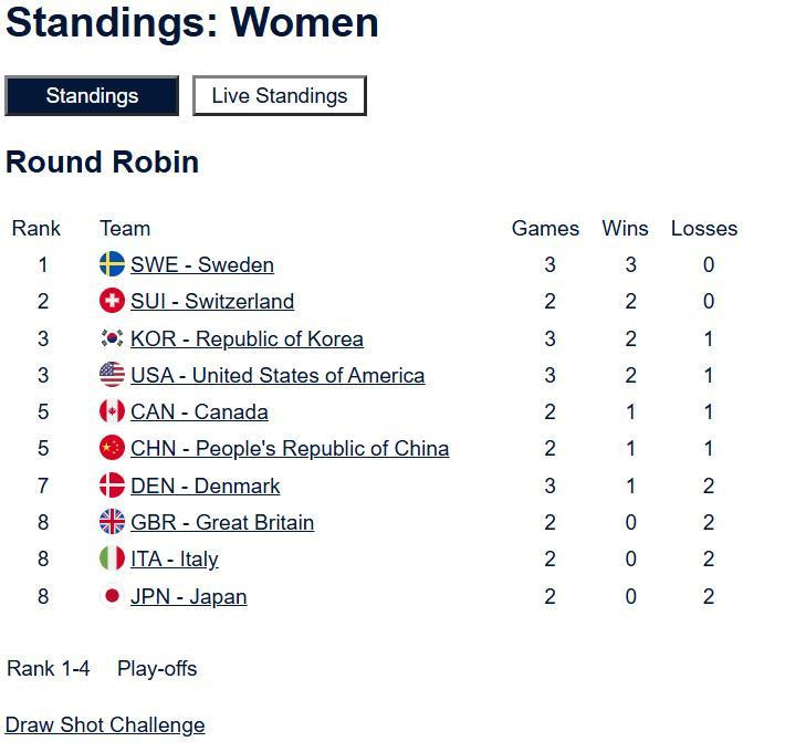 须眉组实现凌晨的积分榜为:加拿大、意大利、瑞士两连胜,英国2胜1负,德国、挪威1胜1负,好意思国1胜2负,中国、捷克、瑞典两连败。