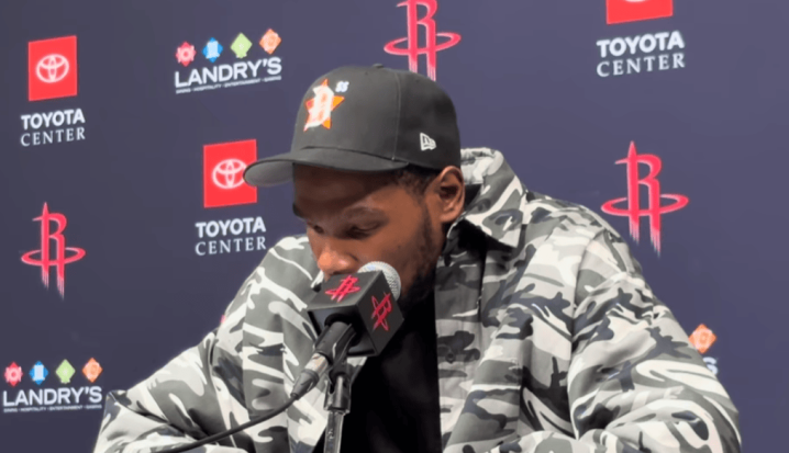 赛后,火箭球员凯文-杜兰特接管了记者采访,并道到了球队的发达。