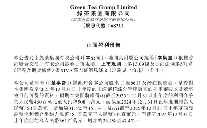 2月24日,“初代网红餐厅”绿茶集团(股票代码:06831.HK)发布了登陆港股后的首份全年功绩预报,揣摸全年净利润将终了31.4%-45.1%的显赫增长。