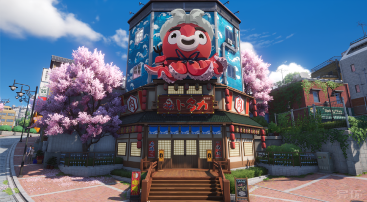 游戏里不少场景和功能性配置互为内外。比方,这个造型颇具特色的居酒屋,实际上是可以参加的,玩家在里面能买到各式食品。