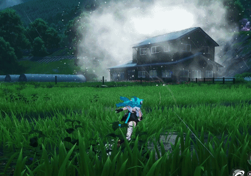 再比如,在一派绿地中被雪花和雾气环绕的房屋: