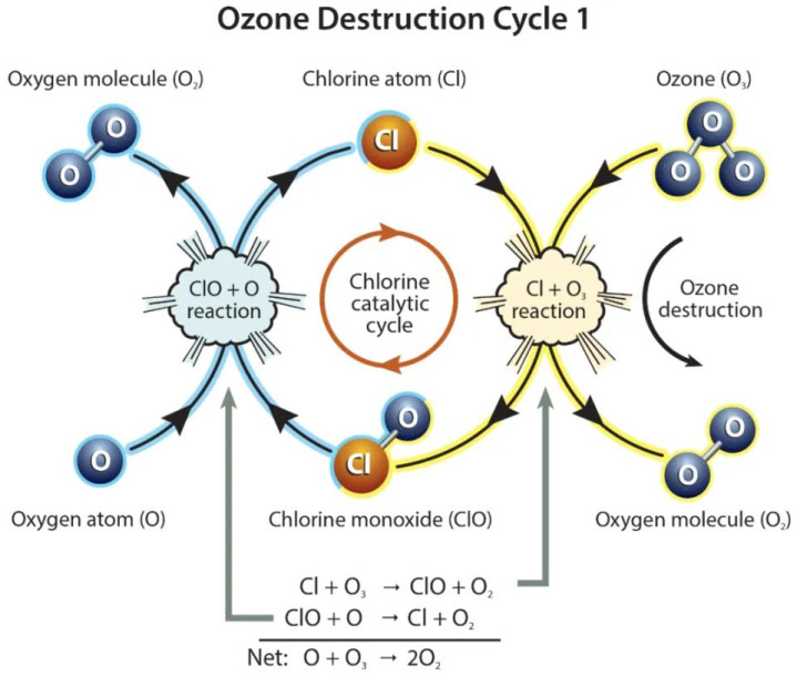 这种氯原子就像饿极了的虫子,特别啃食臭氧层里的臭氧分子。
