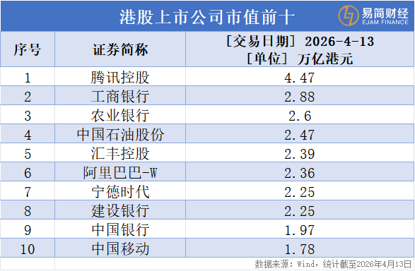 Wind表现,限度4月13日,腾讯控股以4.47万亿港元的市值断层最初,位居榜首,工商银行、农业银行等传统金融威信紧随后来。前十名被金融、科技、能源和电信四大中枢行业主导。