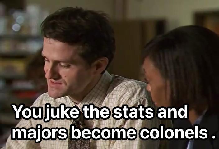 剧里有句台词:You juke the stats and majors become colonels. 刷刷数据,少校能升上校。